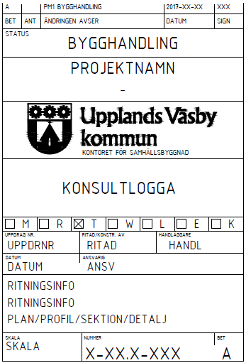 Ritningsstämpel ska placeras i nedre högra hörnet och förses med Upplands Väsbys kommuns logga. Stämpeltext som ritningsstatus, projektbenämning, teknisk disciplin, handlingens benämning och ritningsnummer ska godkännas av Upplands Väsby kommuns projektledare.